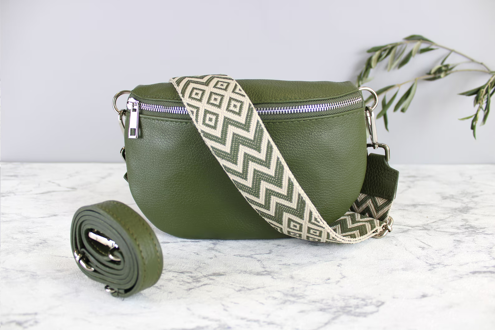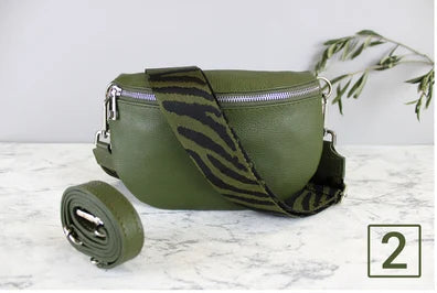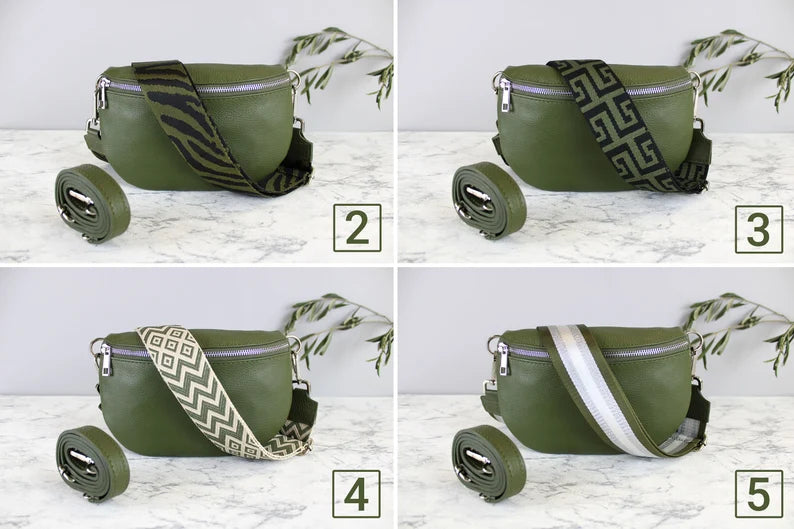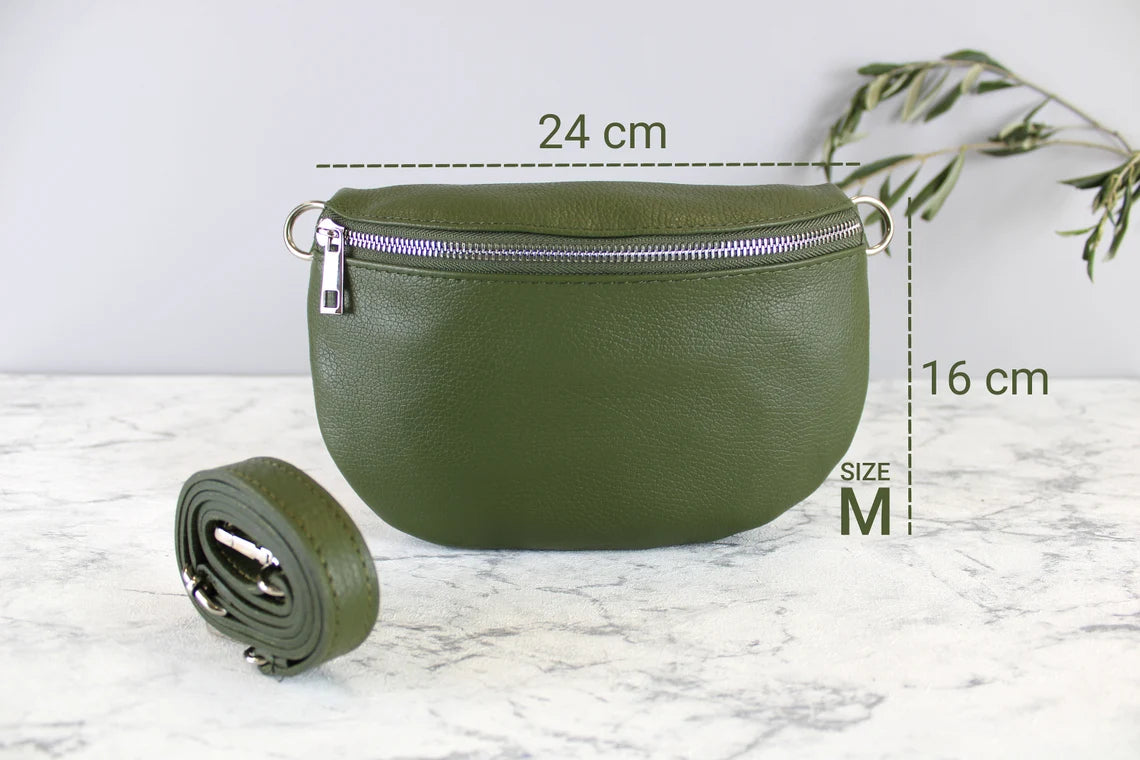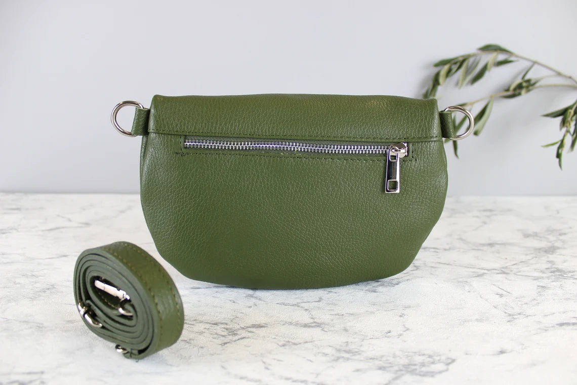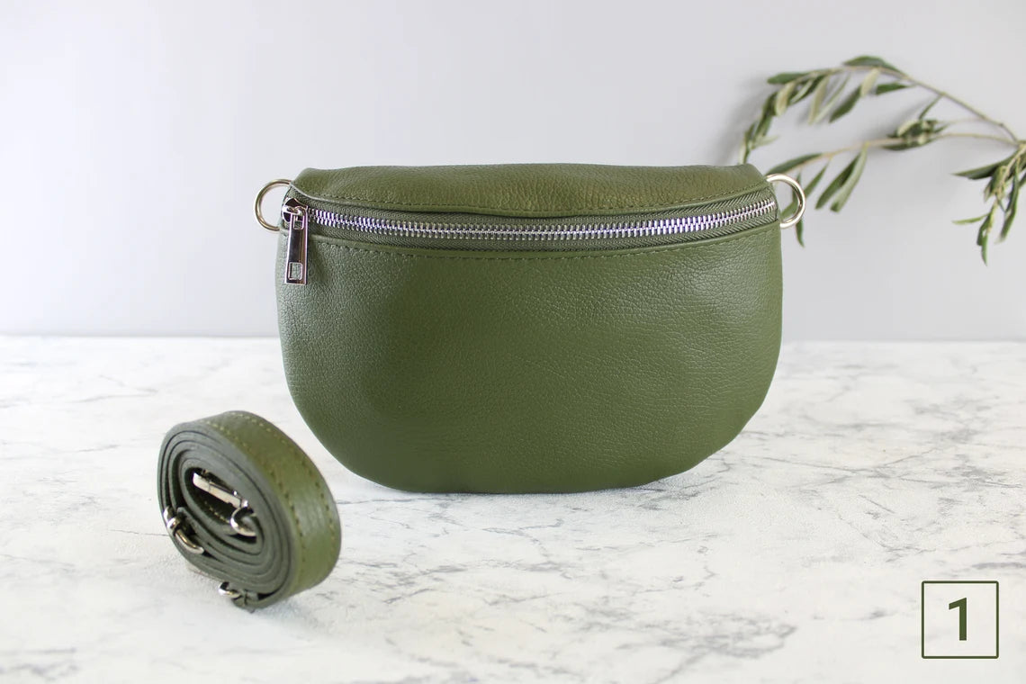 Khaki Green Leather Bag with Strap